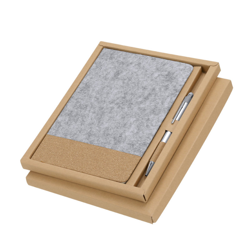 Notepad and ball pen set made of RPET felt and recycled Aluminium. Includes a hard covers notepad, made of RPET felt and natural cork, with 80 lined pages, elastic band closure, bookmark and a brown ball pen holder. In addition, it includes a recycled Aluminium ball pen with grip made of natural cork, push-button mechanism and blue ink. Presented elegantly in a gift box.RPET felt is the result of the combination of the recycling processes of plastic materials along with the millenary technique of felt manufacturing, resulting in an eco-trend material that, in addition to being of recycled origin, also becomes recyclable.