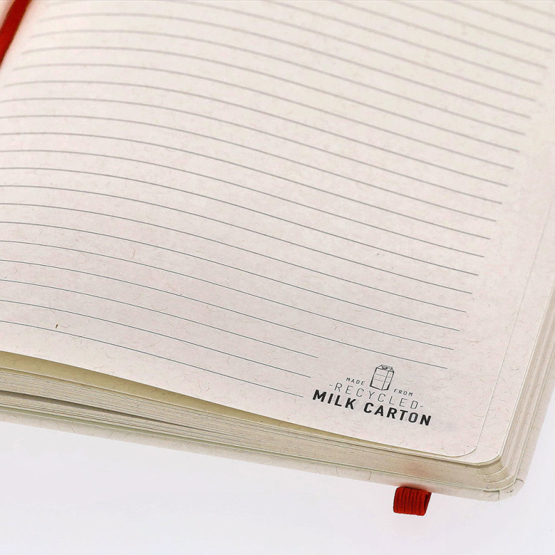 Note block with rigid covers made of recycled milk cartons. Includes 80 natural colored lined sheets, with an elastic band and colored bookmark. Includes Recycled Milk Carton designation on the back cover and interior sheets.Milk cartons are mostly made of cardboard and aluminum. During their recycling process, different materials from the container are separated for reuse and new use, thus contributing to the infinite journey of the circular economy. This material is characterized by its high recyclability, as well as its lightness and strength.
