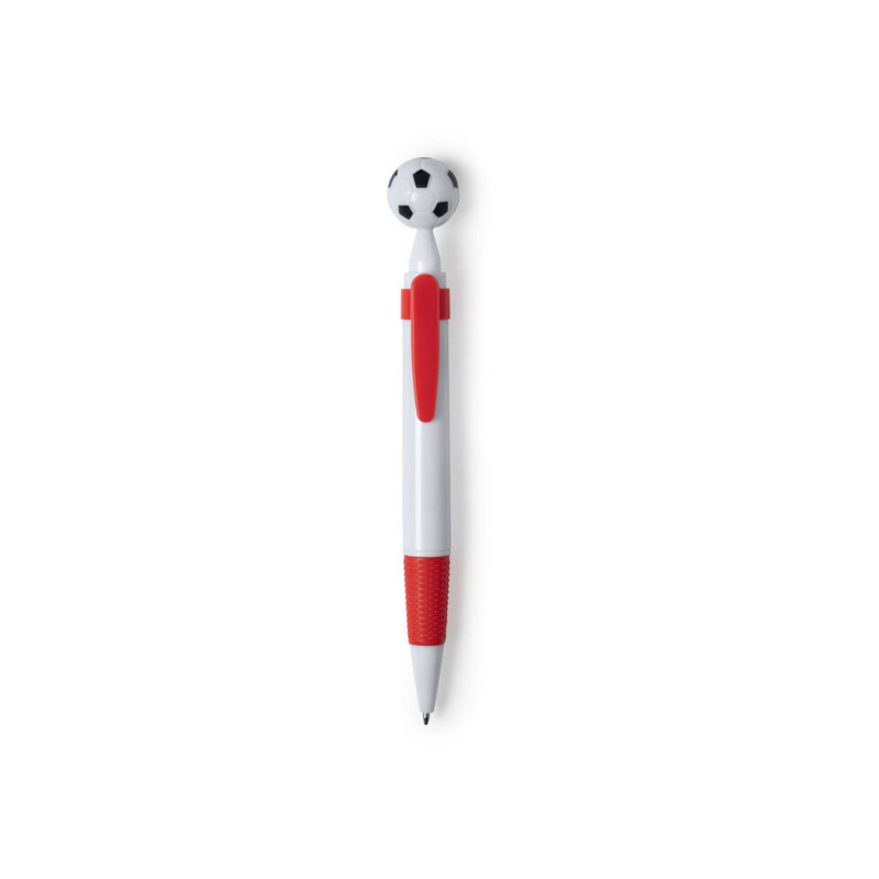 Ball pen for football fans, with detail in the shape of a ball. Push-up mechanism, in an eye-catching, two color design. Body in white color, with clip and grip in matching color and in a wide range of tones. Wide printing area and blue ink refill.