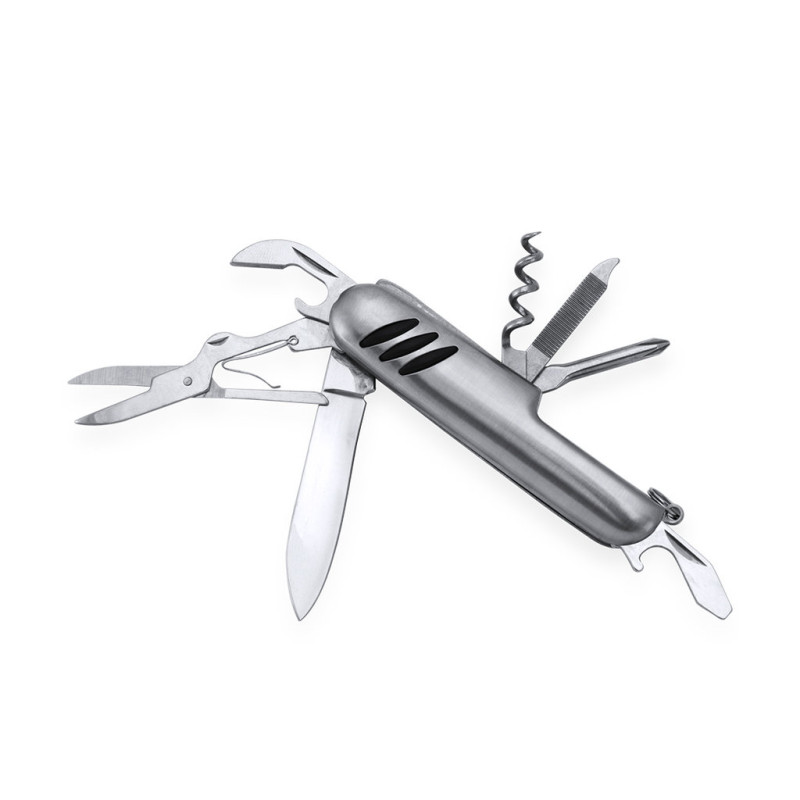 Multi purpose 10-function stainless steel knife with non-slip handle. Includes knife, openers, screwdriver, file, scissors and keychain. Presented in an individual box.
