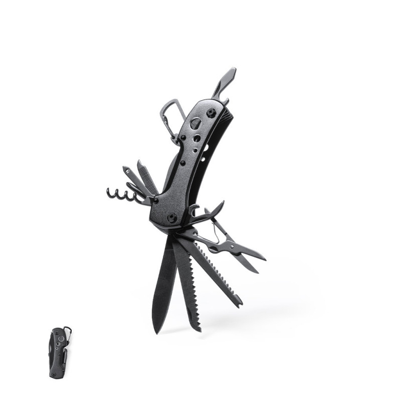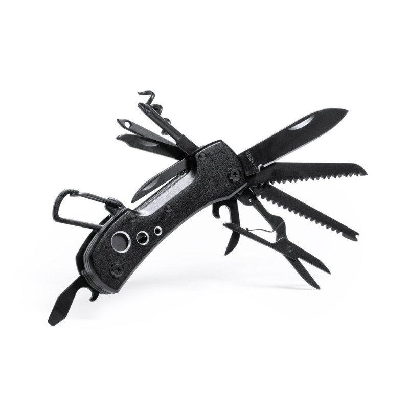 Multi-purpose knife with accessories in stainless steel with black finish. Matching resistant aluminium handle with integrated carabiner. 13 functions, including knife, screwdriver, file, opener, and scissors. Foldable and compact in size, presented in an individual box in black design.