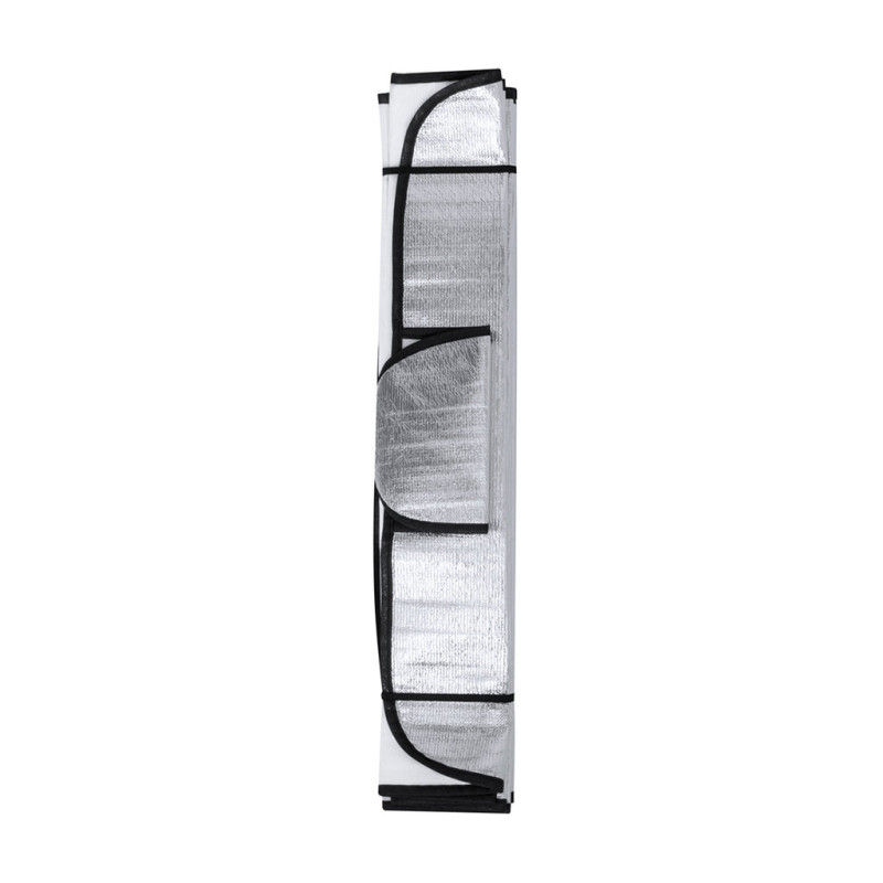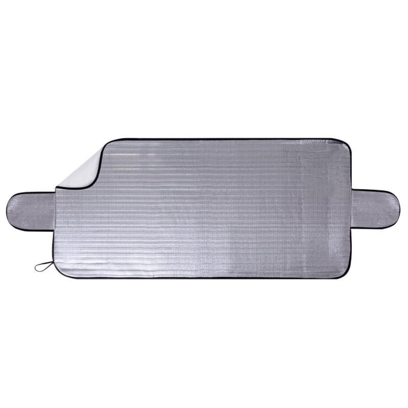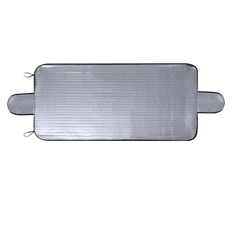 Durable single-sided Aluminium sunshade, designed to be positioned on the outside of the front window and as protection against adverse weather conditions like snow.. Including two side flaps to fit between the frame and the vehicle doors, providing additional insulation to the front window. Roll-up and with elastic bands for an easy storage, and presented in an individual recycled bag.