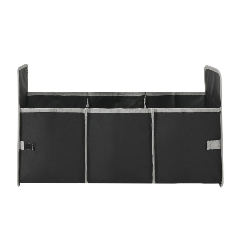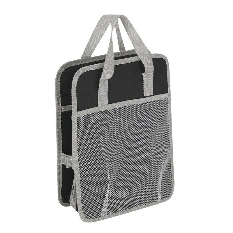 Foldable organizer made of 600D RPET polyester. Ideal for the trunk of the car. With reinforced carrying handles, gray mesh front pocket and velcro straps on the sides for a better fit. Interior with three storage compartments. The RPET material is made from recycled plastic, in order to promote the reuse of plastic waste and help the sustainability of the planet.