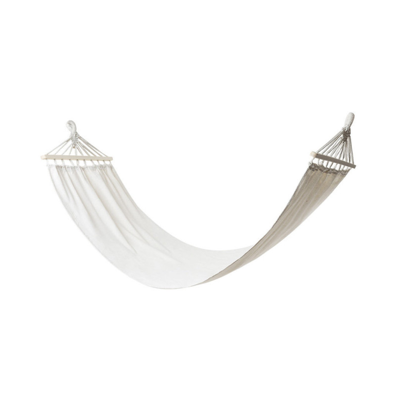 Hammock made of resistant canvas of 320g/m2 and size 190x80cm. With durable tie-down straps and natural wood stands. Resistant up to 120kg. Presented inside a matching canvas pouch.