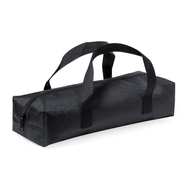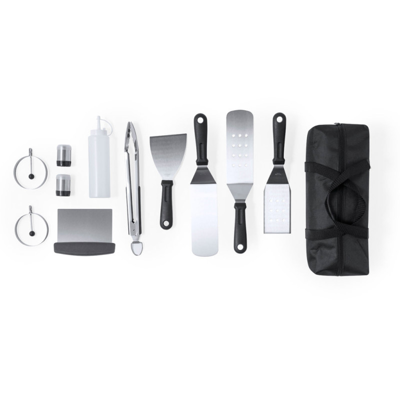 Barbecue set made of stainless steel. Including 11 accessories: 1 smooth spatula, 2 spatulas with holes, 1 scraper, 1 set of tongs, 1 spatula, 1 salt shaker, 1 pepper shaker, 1 measuring can with dispenser and 2 round molds. Everything is presented in an organised way, inside a practical bag with zip closure and handles for easy carrying. Presented in an individual recycled bag.