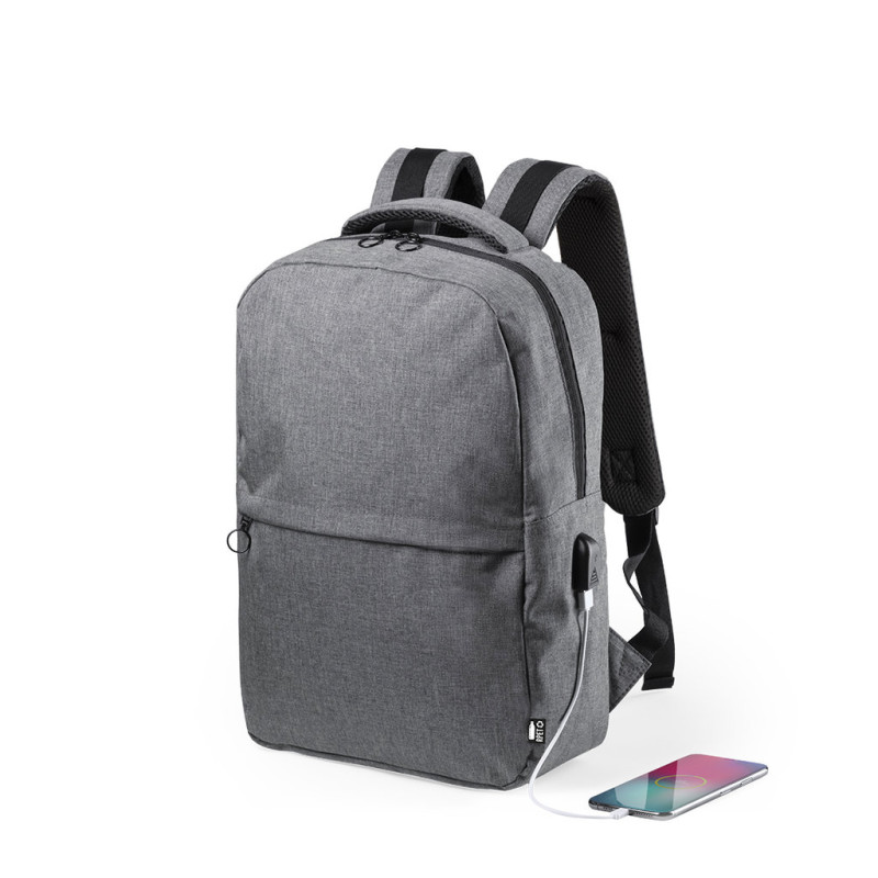 Business backpack in resistant 600D RPET material, obtained from recycled plastic materials, to encourage the reusing of plastic residues and contribute to the Earth’s sustainability. With double puller zipper pocket and front pocket. Inside compartment with padded pockets for tablet up to 10 inches size and laptop up to 15 inches size, including USB connection for mobile devices charging (cable included, auxiliary battery not included). Reinforced corners and accessories in black color. With padded back and adjustable, padded, shoulder straps. RPET distinctive in label.