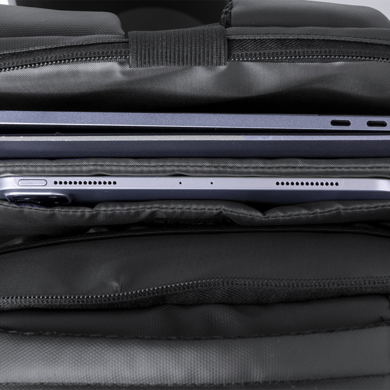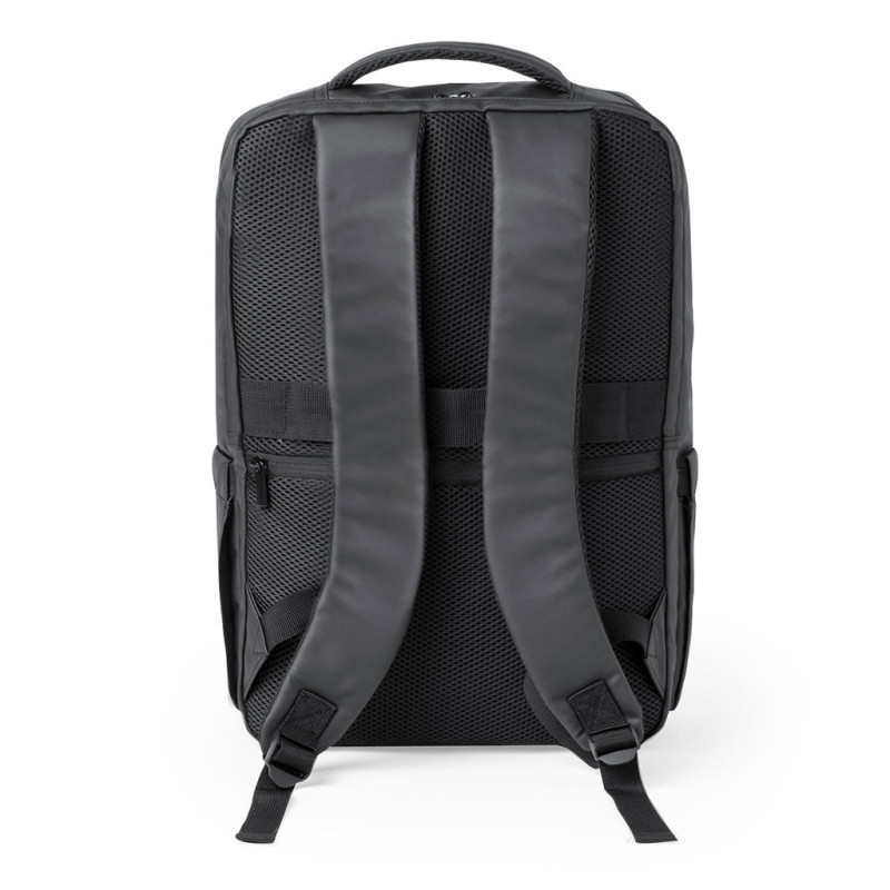 Premium quality Antonio Miró backpack in resistant leatherette with a sober design in black. With double zipper closure, front pocket and reinforced padded handle. With ergonomic padding on the back and shoulder straps, it includes a padded interior compartment for a laptop up to 15 inches and for tablets up to 10 inches. In addition, with an anti-theft pocket with zipper closure on the back. Interior covers for pens and smartphone. With brand logo on the front.
