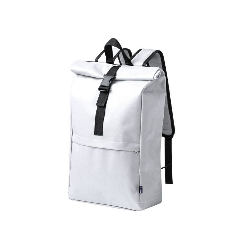 Backpack made of durable 600D RPET. Features a main pocket with buckle closure and an additional front pocket with zip closure. The shoulder straps are padded and adjustable. RPET badge on the outer label. Available in a variety of colours, with black accessories. Individually packaged in a Recycled bag.RPET material is made from recycled plastic to encourage the reuse of plastic waste and help the sustainability of the planet.