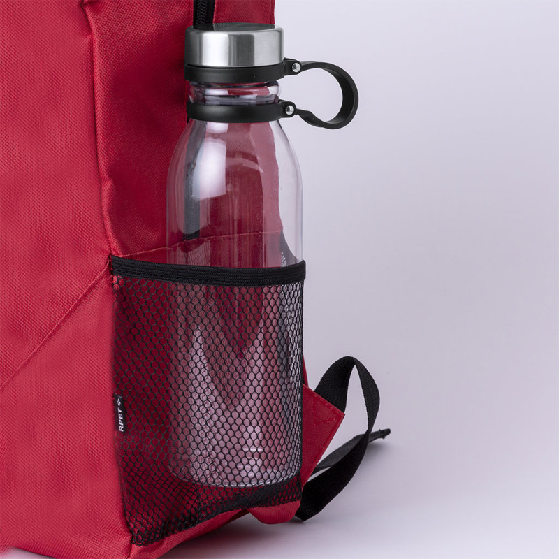 Backpack made of durable 600D RPET. It has a main pocket with zip closure and double puller. The shoulder straps are padded and adjustable. With mesh pockets on the sides, as well as adjustable elastic cord at the front. Available in a selection of colours with black accessories, presented individually in a Recycled bag. RPET badge on the outside label.RPET material is made from recycled plastic to encourage the reuse of plastic waste and help the sustainability of the planet.