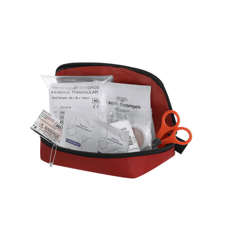 Emergency kit with 20 accessories in a sturdy 600D polyester case with single pull zipper closure. Includes sterile gauzes, bandages, alcohol towels, adhesive tape, safety pin, and scissors. With straps for hanging to facilitate better transport.