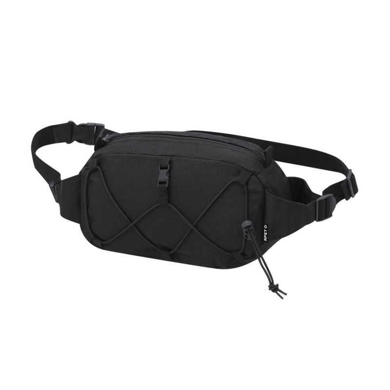 Fanny pack made of 600D RPET polyester. It has a main pocket with invisible zipper closure in black, with black metal puller, and adjustable strap with buckle closure on the strap. On the front it includes an adjustable elastic cord. Includes distinctive RPET label.