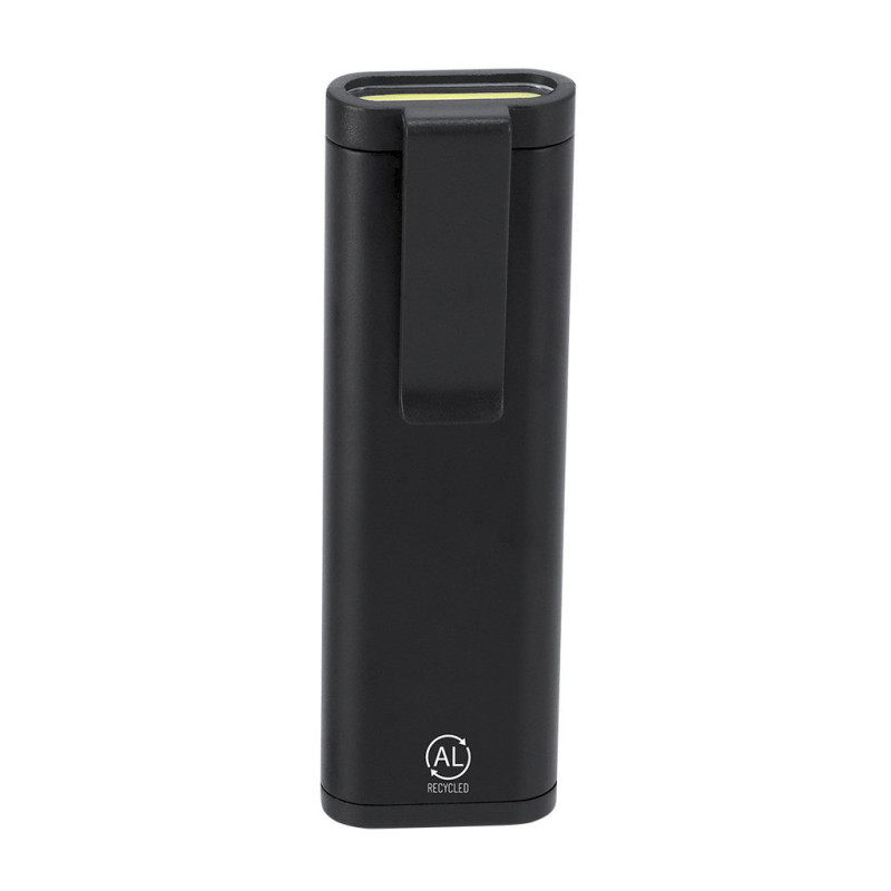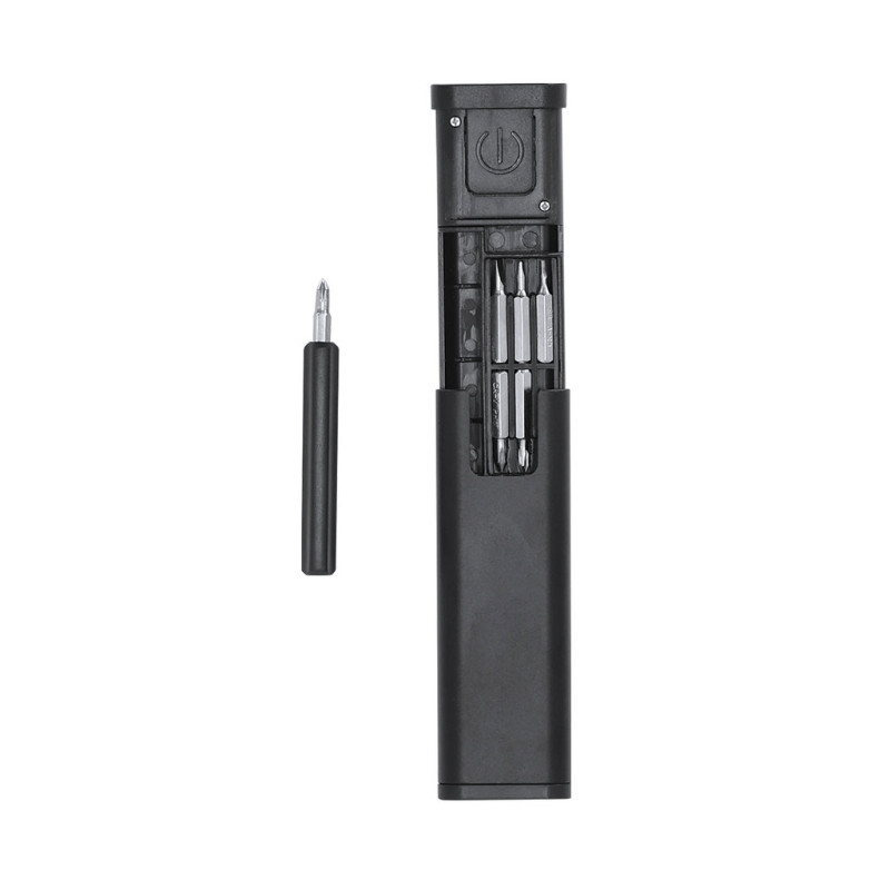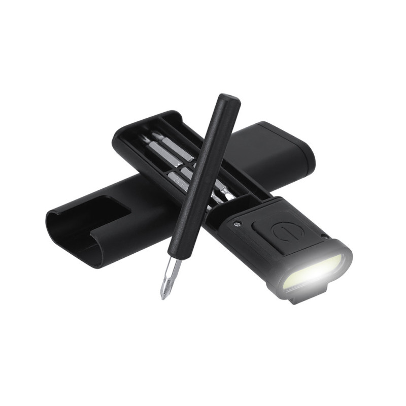 Tool set made of Recycled Aluminum. With 2-in-1 function; 4LEDs flashlight-shaped case, with storage interior for 6 tools; Multifunction handle for compatible star and flat heads. Includes handy clip to always carry with you. Button batteries included.
