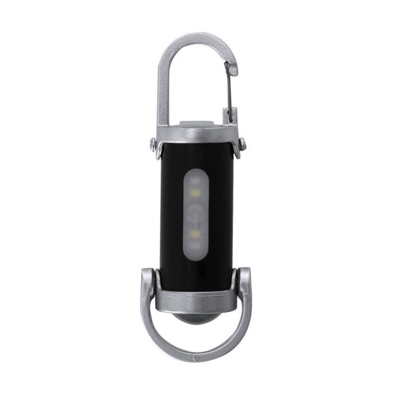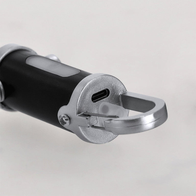 Flashlight made of ABS with carrying carabiner. 4 LEDs, button ignition system and 8 COB lights. 7 fixed and flashing light positions. Practical carry handle at the bottom. 400mAh rechargeable battery, with included 5V Type C charging cable.