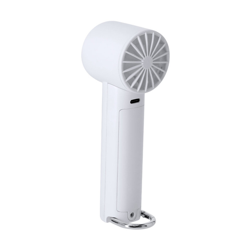 Portable fan in ABS with matte finish. It has an on/off button and aluminum carabiner with support function at the lower end, ideal for comfortable transport. It has 3 speed modes. Power: 2–6 W. Rechargeable Li-Ion 14500 battery of 1200 mAh and 3.7 V. USB-C input 5 V DC 1 A. Includes USB-A to USB-C cable.