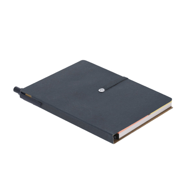 Pad with adhesive notes in recycled cardboard. With rigid covers, it includes a block of 70 white sheets of one-line arrangement. The inside cover of the cover includes: 25 yellow adhesive sheets 6x3.8 cm, 25 yellow adhesive sheets 7.5 x 9 cm and 100 mini adhesive notes of various colors and practical pen in recycled blue ink cardboard with push button system. Includes matching elastic strap to secure closure.