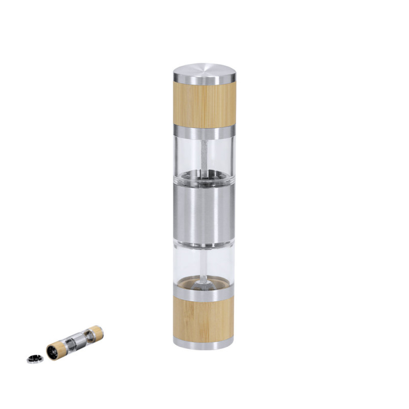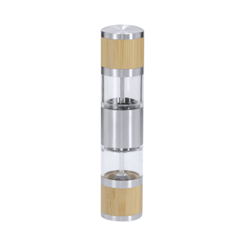 Manual grinder for salt and pepper made of Bamboo and Stainless Steel. Includes two separate compartments for salt and pepper, each with internal ceramic grinder and manual thickness adjustment. It has a window to view the level.