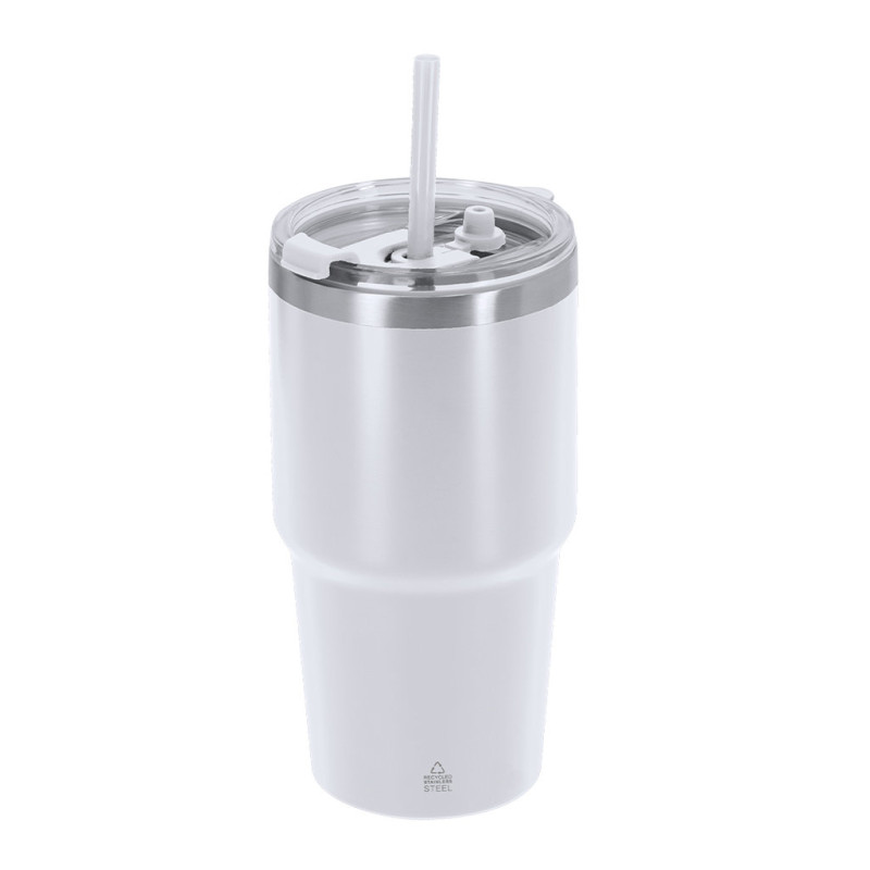 Thermal cup made of double-walled recycled stainless steel with a capacity of 650 ml. It has a double drinking system: hole with hermetic closure and integrated straw, adapting to usage preferences. It has a cap for airtight closure when the straw is removed. It is ideal to have on your desk, table or on any surface where you can quietly enjoy your favorite drink. With Recycled Stainless Steel logo.