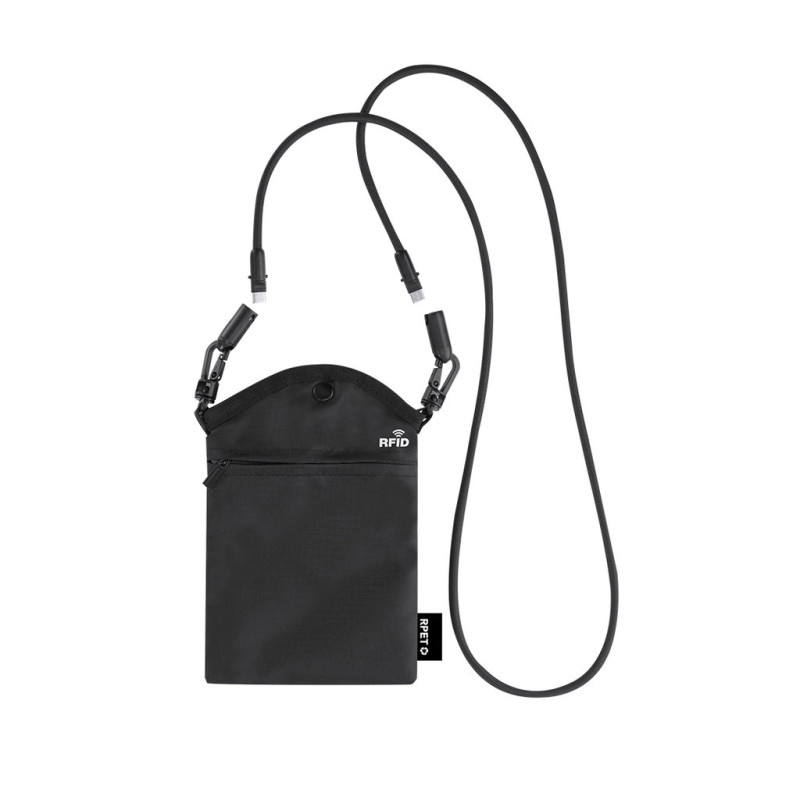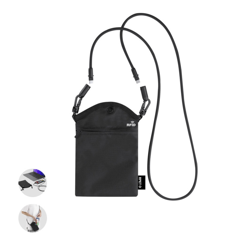 Pencil case made of RPET. Main compartment with button closure and front pocket with zipper closure system. Includes RFID protection system, designed to block unauthorized access to contactless cards. 2 in 1 transport strap attached by carabiners with cable function suitable for data transfer, with 60W Type C connection. Includes RFID and RPET logo.