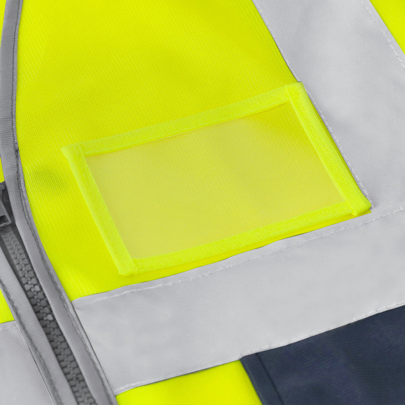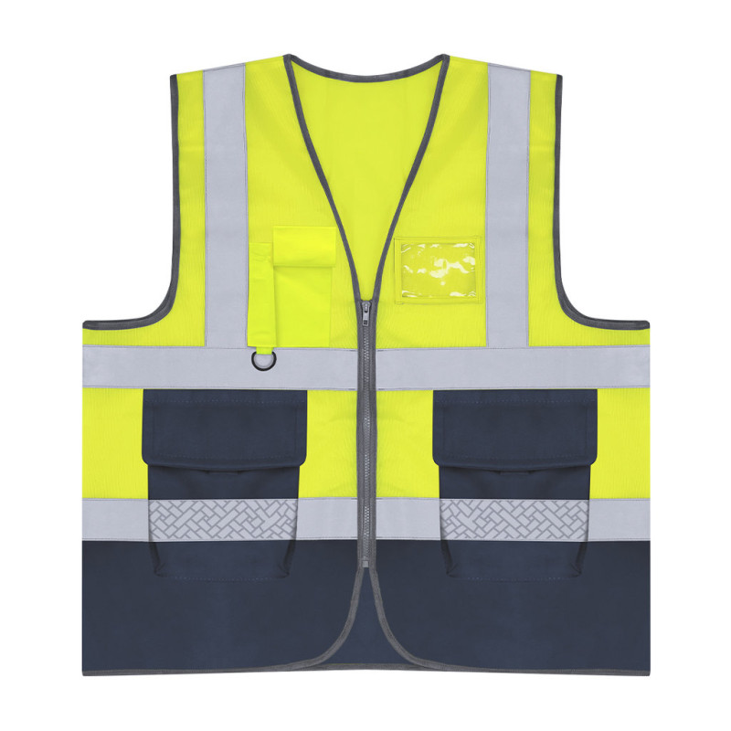 High visibility vest with two-tone design. It incorporates two horizontal reflective bands on the body and two additional ones on the shoulders, improving visibility in low light conditions. It has a front zip closure and several functional pockets:- Two front side pockets (16 x 18.5 cm)- Top right pocket with velcro closure (6.5 x 15 cm)- Compartment for ID card (10.5 x 8 cm)-Plastic ring in the top pocket, ideal for attaching keys or accessories