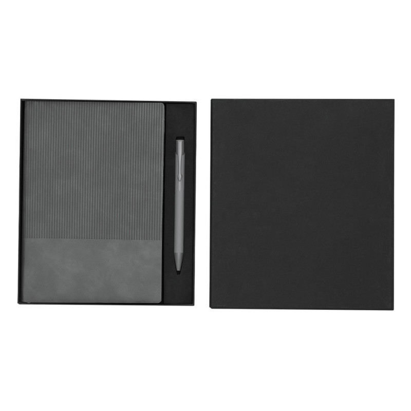 Set of notepad and pen made of Recycled PU and Recycled Aluminum. The set includes: - Notepad made of recycled PU, with flexible covers. Includes 96 cream-colored pages with lines, a matching bookmark. With PU Recycled Badge. - Recycled aluminum pen, with a rubber finish body. It has a clip, push button mechanism and blue ink. Includes recycled aluminum badge.