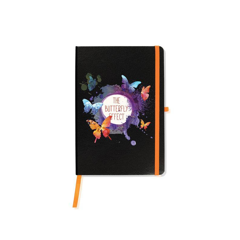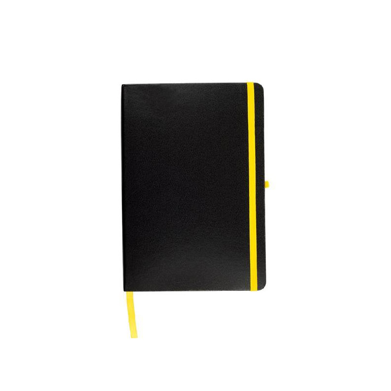 Notepad A5, with cardboard cover and pouch. The contrast of this block catches all your attention. A pad with 160 plain pages of 70g, sourced from responsibly managed forests. With a black cover, it gives rise to the highlight of the elastic band, ribbon and colored pen holder. Ideal for highlighting a colorful personalization.