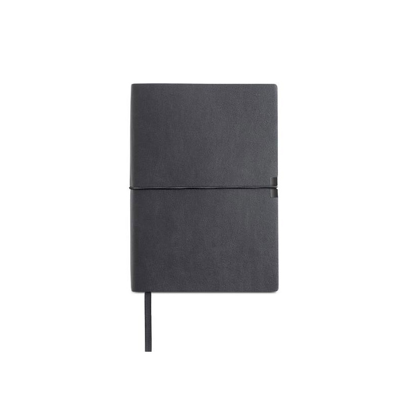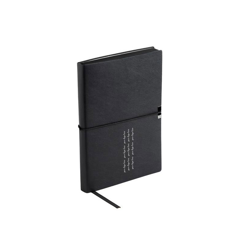 Perpetual notebook. With malleable PU sling, black lining, horizontal tubular elastic and strap. The interior is made up of 336 70g pages sourced responsibly managed forests, perpetual model rooms, the meeting block, with a place to replenish the theme. Language: PT / ES / EN / FR