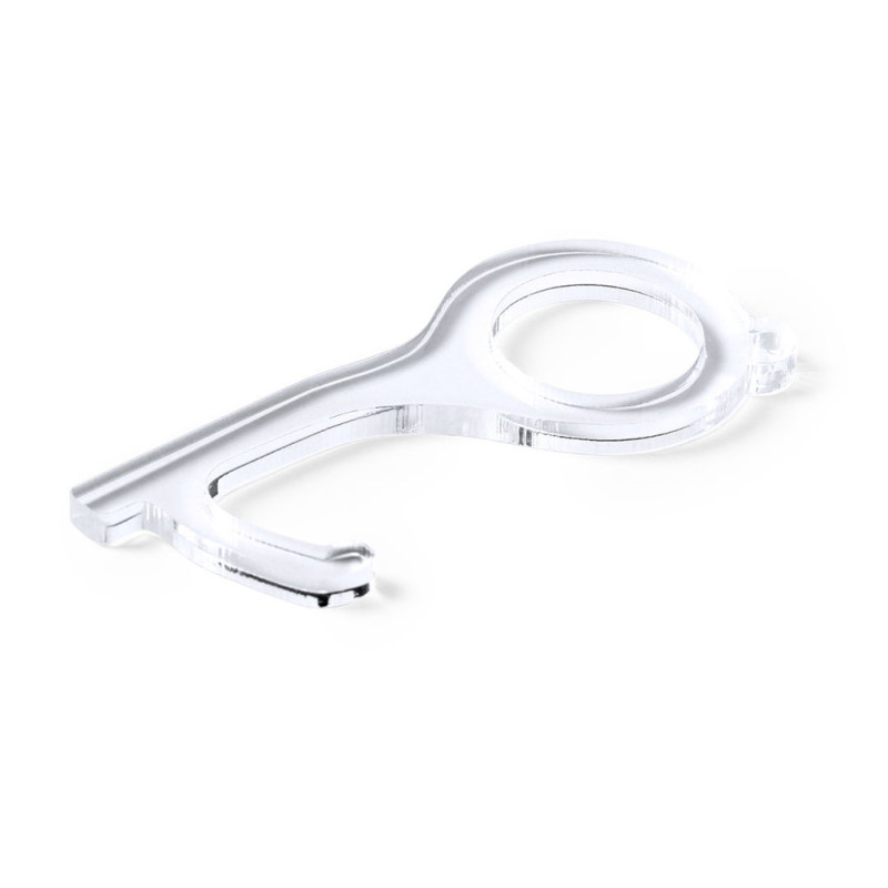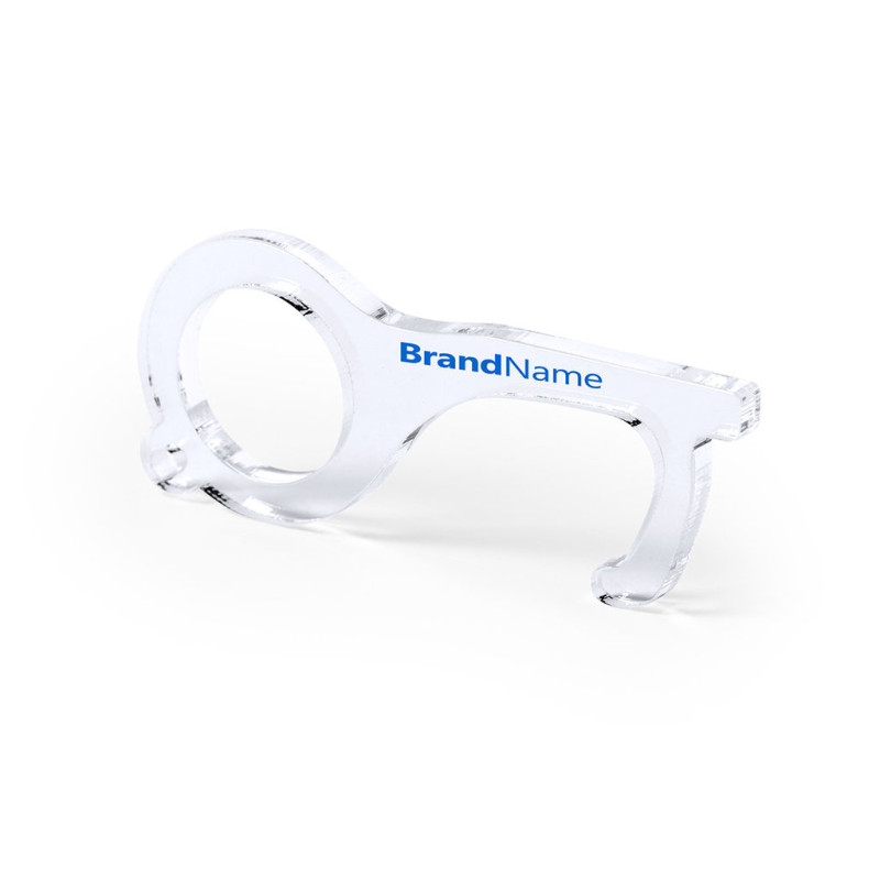 Hygienic anti-contact key ring, made of durable and eye catching acrylic material in a transparent finish. Specially designed to avoid touching common surfaces with your hands (door handles, switches, public taps, ATMs...). With a comfortable finger die cut and presented in an individual design bag. Recommended for pad printing.