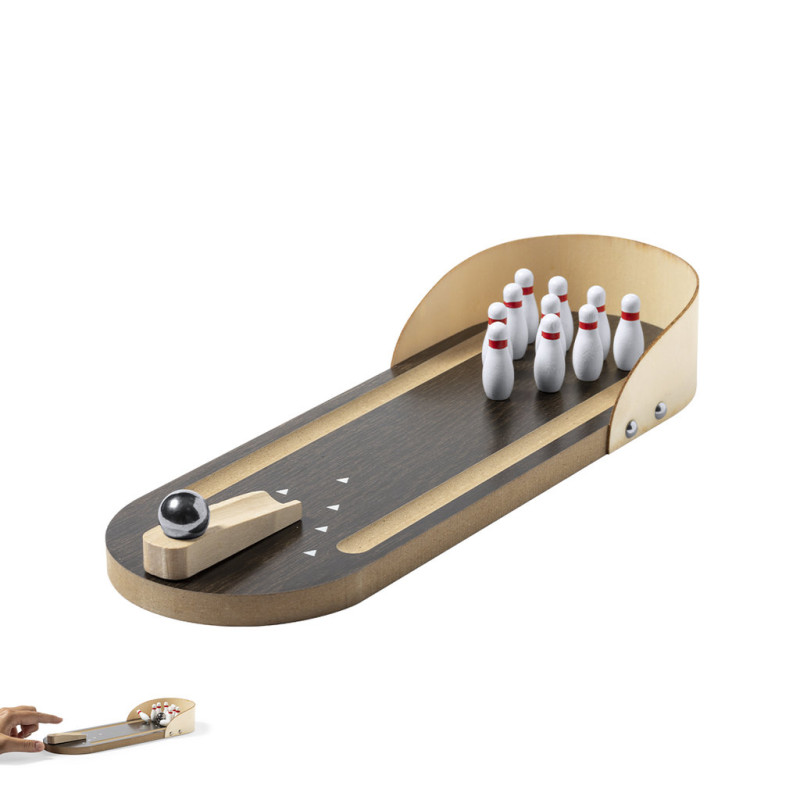 Mini bowling game, made of resistant wood. Includes 10 pins and metal ball, with adjustable launching ramp. Test your skills with this fun and addictive game. Presented in an attractive individual design box with kraft finish.