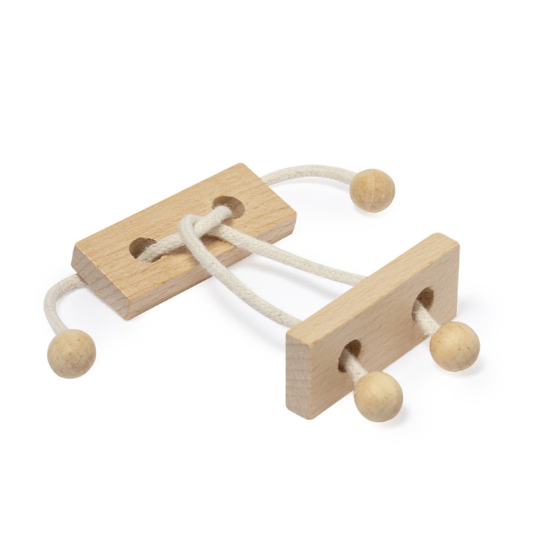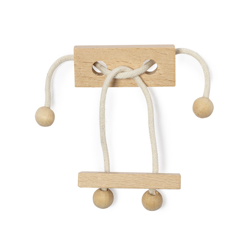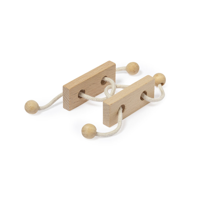 2-piece skill game made of wood. Fun puzzle of two pieces joined by a wooden string, with the objective of finding the way to separate the two pieces. Presented individually in a kraft design box.