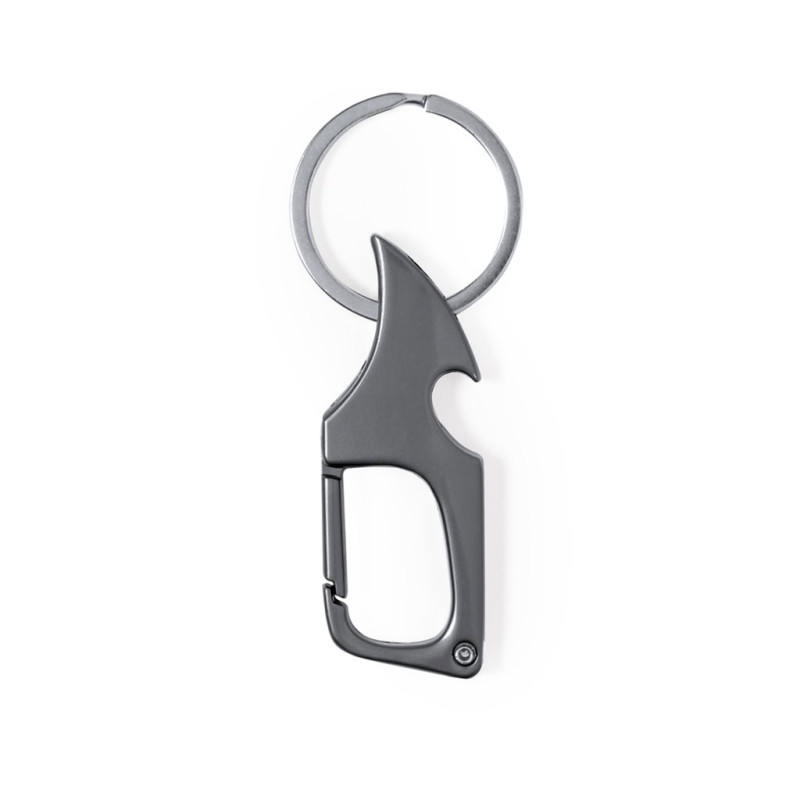 Useful metal opener with key ring and carabiner for quick attachment. With bottle opener on one end and with a small stainless steel knife on the opposite end, ideal for opening letters, packages... In an elegant metallic black colour and presented in a Recycled paper bag.