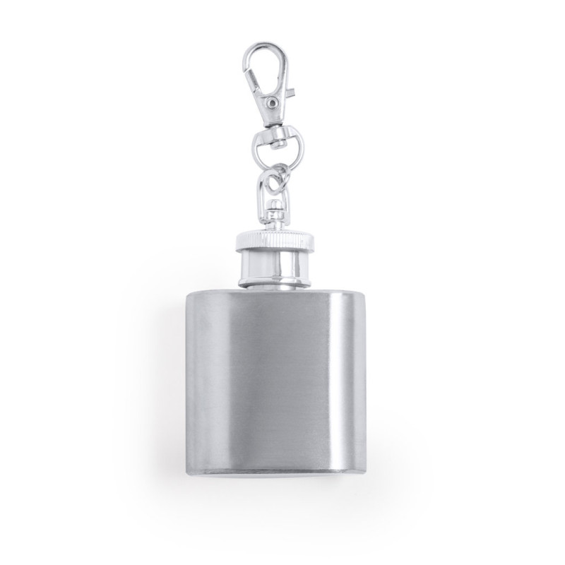 Handy flask keychain made in stainless steel, with 30 ml capacity. Lid with screw-on security lid and swivel hook. Presented in an individual, kraft design box.