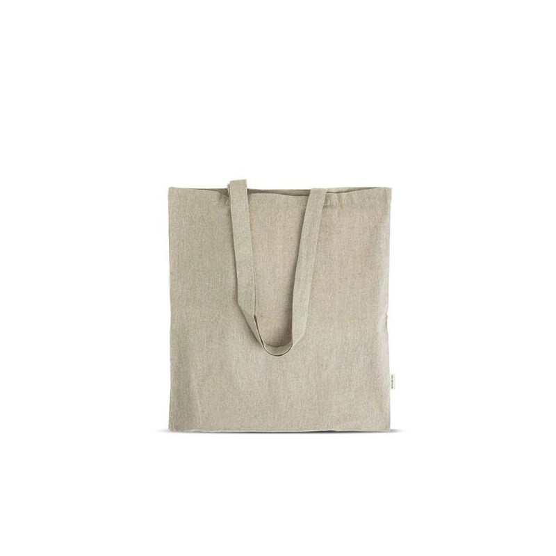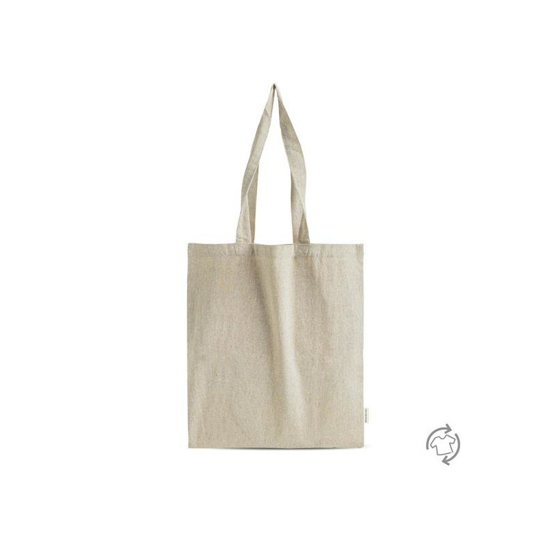 Recycled melange cotton bag 150g/m², with dimensions 38x42cm. Made from 100% recycled cotton from pre-consumer fabric cuttings. During the garment manufacturing process, small fabric scraps are reused and transformed into a new material, resulting in a strong fabric with a naturally light tone. This bag combines sustainability, quality, and simplicity in a versatile design, perfect for everyday use. An eco-friendly choice that gives new life to fabrics and reduces waste.