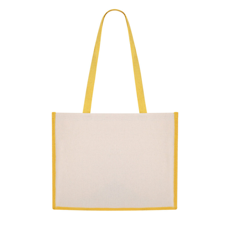 Nature line bag in combination of laminated jute and laminated cotton materials. Size 39 x 31,5 + 16 cm, with stitched finishing and long reinforced handles 76cm length. Resistance up to 12 kg weight.