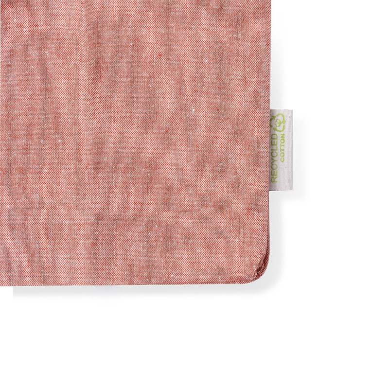 Bag in recycled cotton material 140 g/m2. Long handles of 70cm with reinforcement, stitched finish and gusset. Recycled cotton label and resistance up to 8 kg in weight. Available in a wide range of eco colours, combined with a natural base.