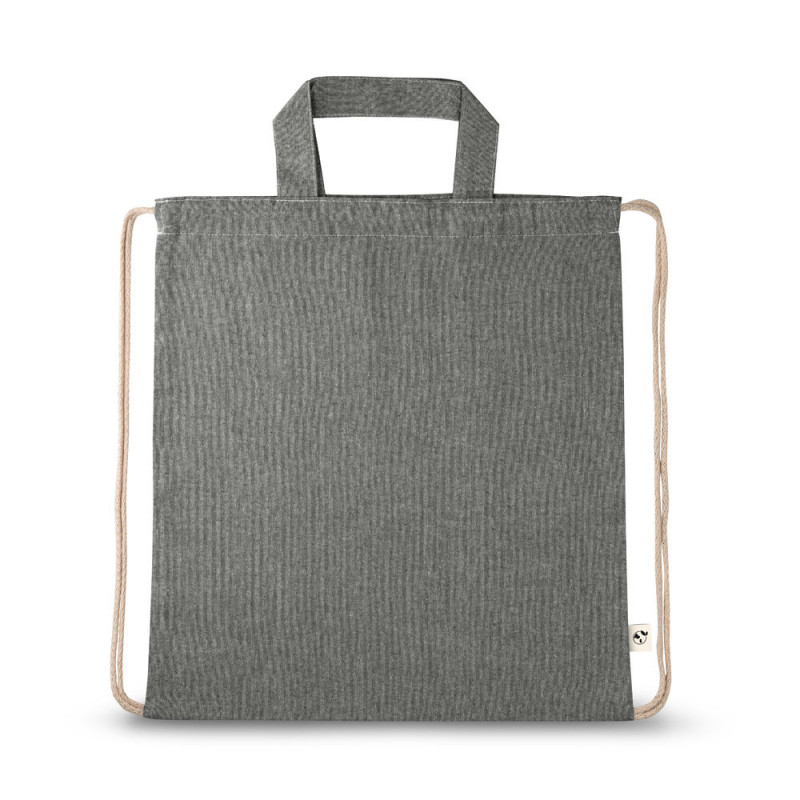 Drawstring bag in recycled cotton (70%) and polyester (30% rPET) (140 g/m²), with 30 cm handles and cotton cords for closure. Recycled cotton is undyed. The raw material is used in its original form and color, without the use of dyeing or bleaching chemicals, contributing to a lower impact. 370 x 410 mm