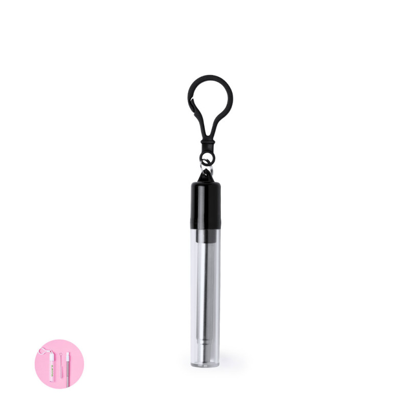 Reusable and extensible straw in stainless steel material with silicone tip. Including cleaning accessory and presented in a transparent case with carrying accessory.