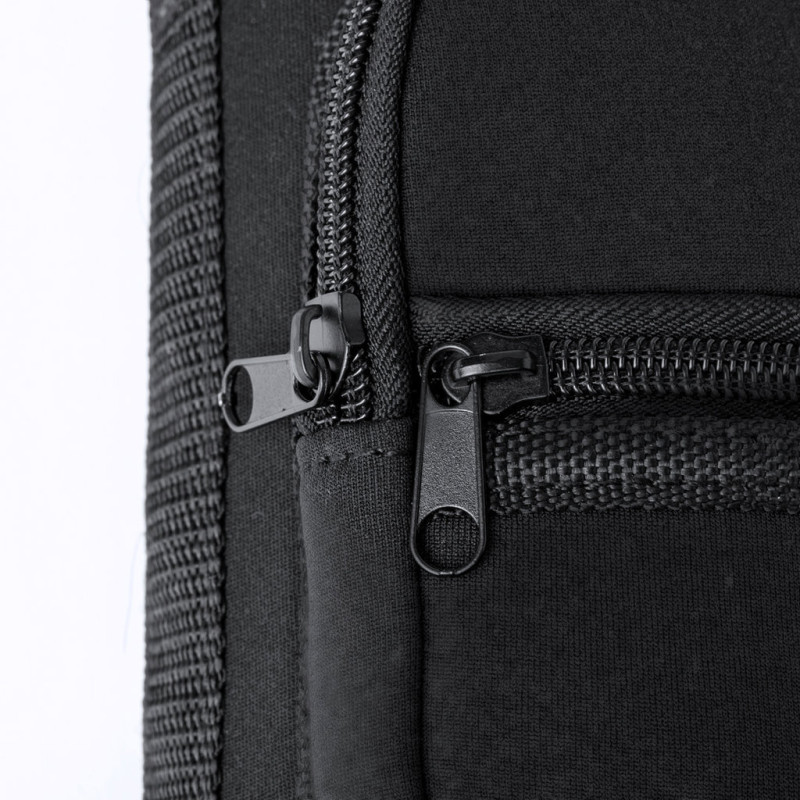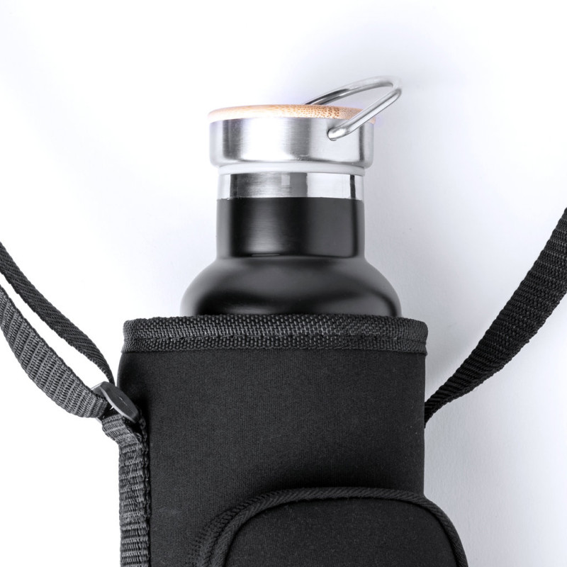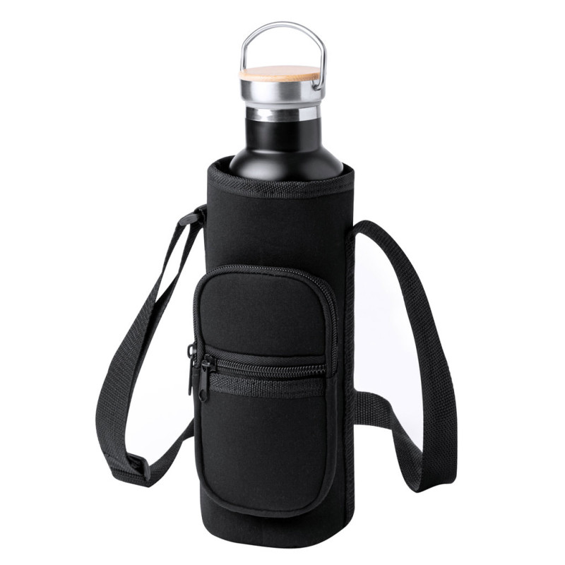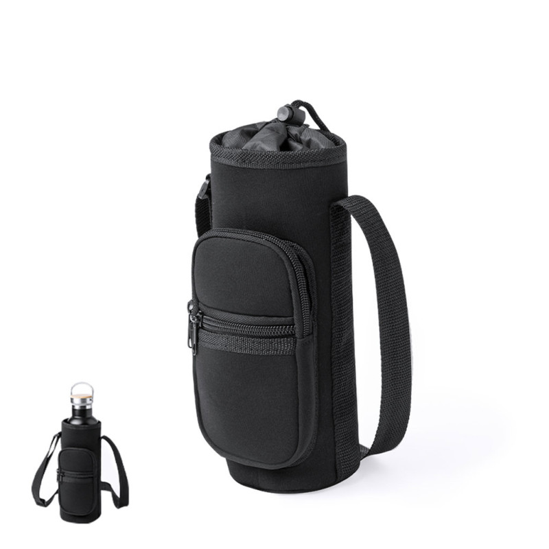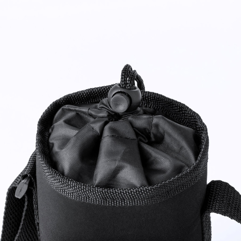 Holder for bottles up to 1.5L, made of soft shell. With drawstring closure and comfortably worn, with adjustable shoulder strap. With zipped front pockets and presented individually in a recycled bag.