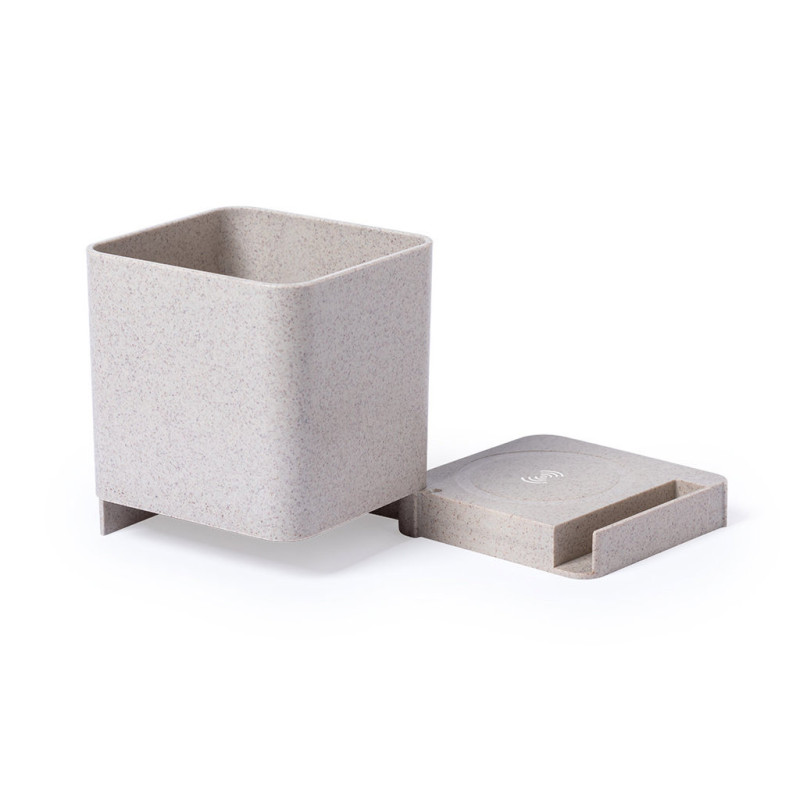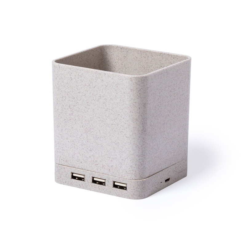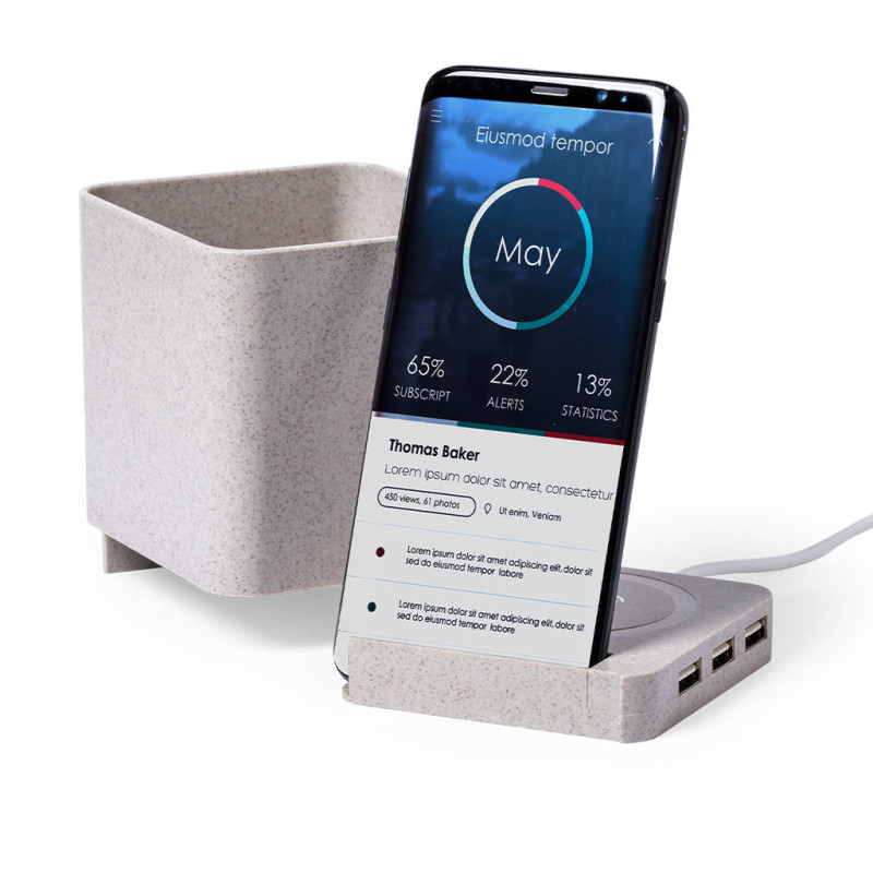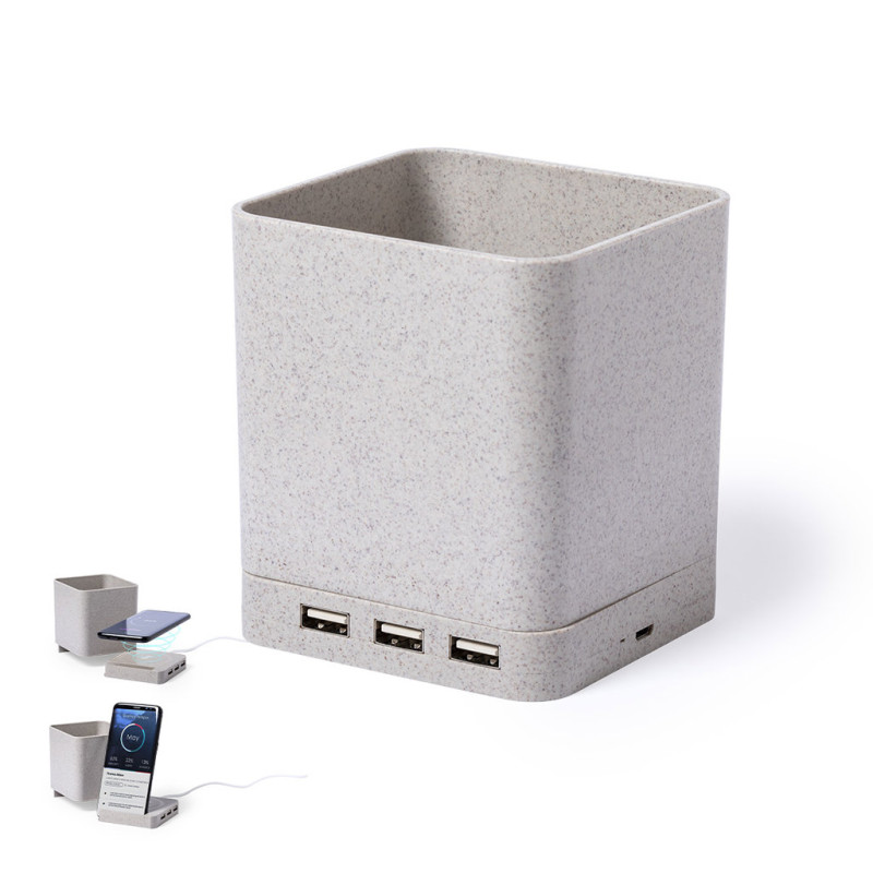 4 in 1 nature line multifunction pen holder. Manufactured in wheat straw, to encourage the use of natural raw materials and reducing contaminant emissions. With pen holder, smartphone holder, wireless charger and USB port (3xUSB 2.0) functions. Compatible with smartphones equipped with wireless charging technology. Including 1 meter long , white color micro USB cable. Presented in an attractive eco-design box. Instruction manual available in Spanish and English.