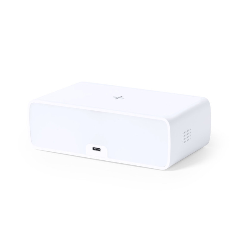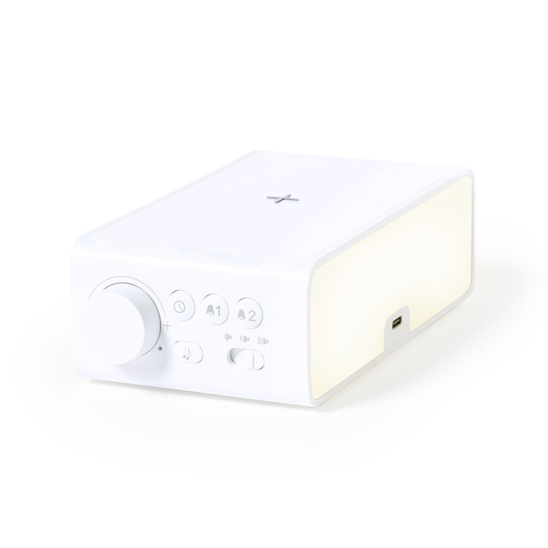 Multifunction watch in elegant white design, with integrated 10W wireless charger and LED lamp. Date/time function, alarm and 36 LED lamp with dimmable light intensity. USB connection, including 100 cm Type C cable and auxiliary power supply with button cell batteries (included). Compatible with devices equipped with wireless charging technology. Presented in an attractive design box. Compliant with safety requirements: Overheating protection system.Overcharge protection system.