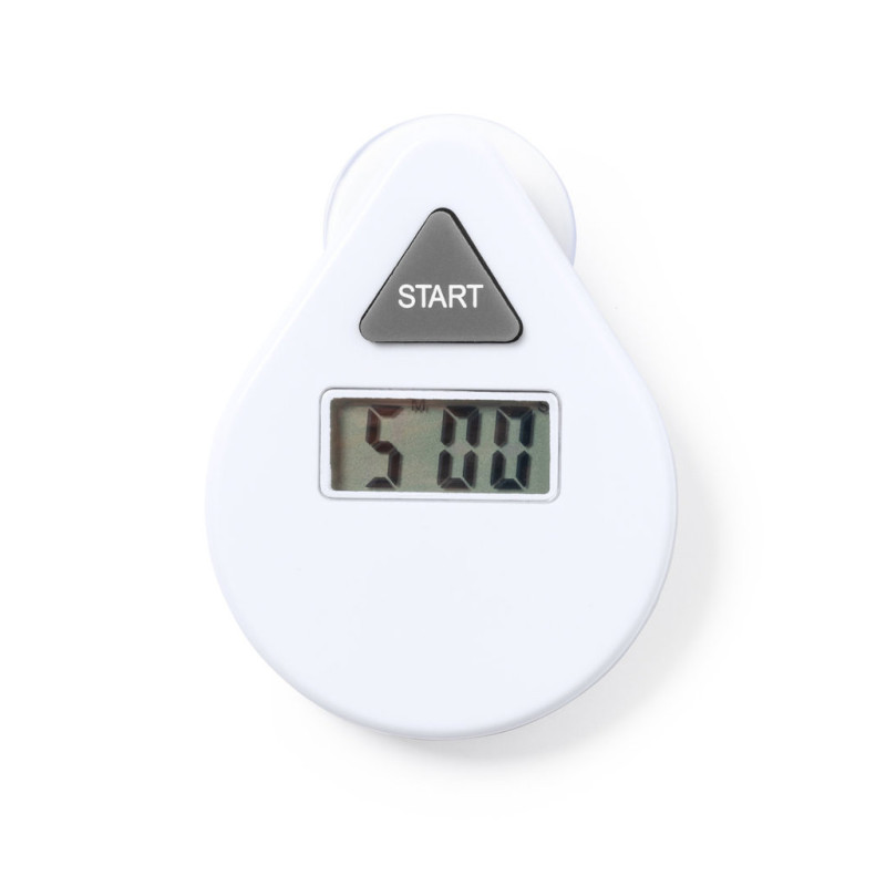 Timer made in resistant ABS, with white finish and suction cup fixing. Easy-to-read LCD display, with countdown control button (5 minutes). Battery powered (button cell included). Presented in an individual kraft design box, with instruction manual in English and Spanish.