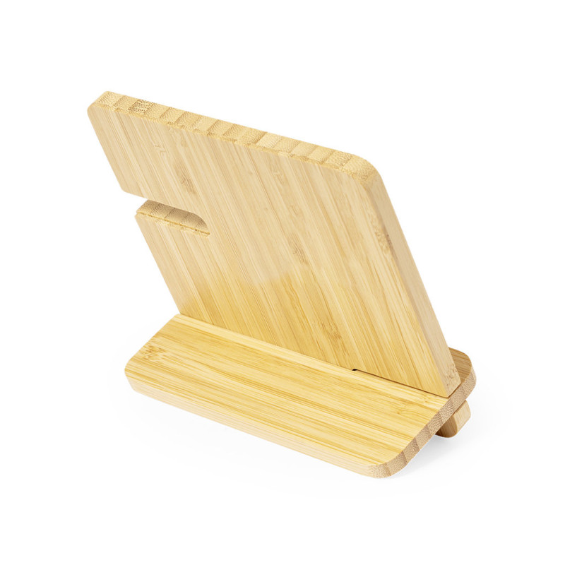 Complete 15W wireless multi-charger with gadget holder, made of bamboo. Designed for simultaneous charging of smartphone, headphones and smartwatch: a versatile all-in-one charging station with different holders. Presented in a kraft design box. Instruction manual available in English and Spanish.Materials such as bamboo encourage the use of natural raw materials, reducing pollutant emissions. It comes from a highly resistant and versatile plant with rapid growth and regeneration, making of it an excellent alternative to traditional wood.Manufactured according to RoHS standards and in compliance with the following safety requirements: Overheating protection system. Over-charge protection system. Blocking system to prevent short circuits.