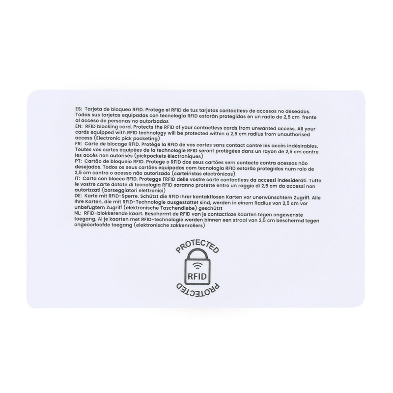 Card with RFID protection system, designed to block unauthorised access to contactless cards. Operates through an electromagnetic field that interferes with reading signals, protecting cards (bank, credit, public transport, etc.) within a radius of 2–3 cm around the card.