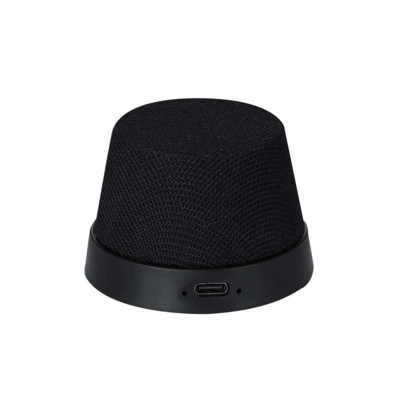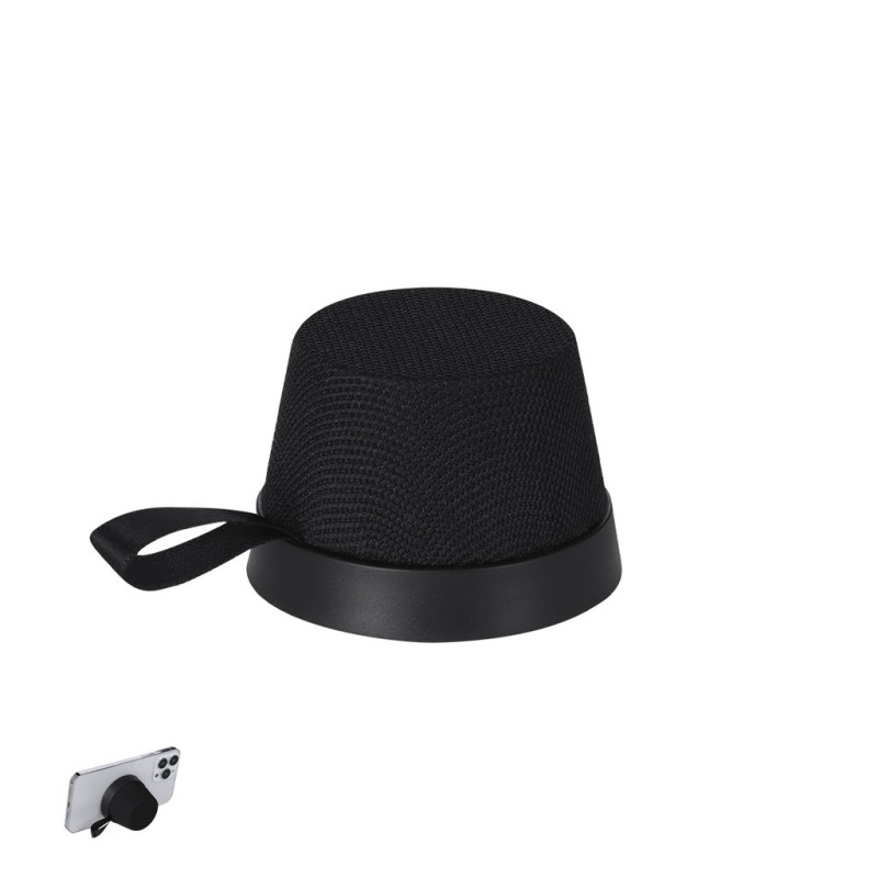 3W Bluetooth® speaker with magnetic hook made of RPET Polyester. Magnetic holder to put on the back of your smartphone. Includes polyester handle for easy transport. Bluetooth 5.3 connection, type C charging cable.