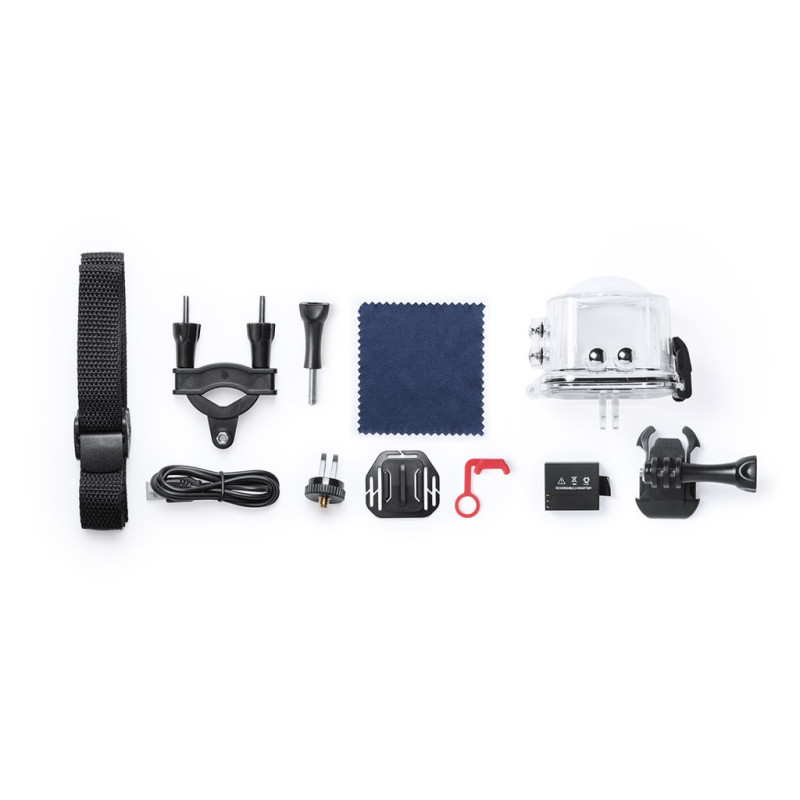High quality 360° sports camera with HD 2448p video capture, compact and resistant design, especially designed for intensive use. Including a submersible housing and a wide range of accessories for adjustment in helmet, handlebar or belt, as well as adjustable straps for head and torso. The versatility and endurance of this sports camera make it the perfect gadget to capture, with exceptional quality, any sport or leisure activity in 360°. With Wi-Fi function, Full HD 1080p camera, micro USB card slot up to 64GB, 0.96 inches LCD screen, multi-language system, and rechargeable via mini USB cable -included-. Presented in an attractive design box.