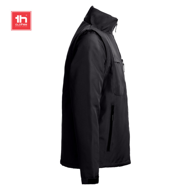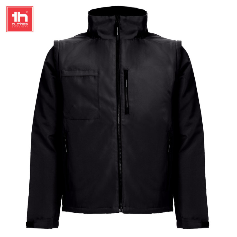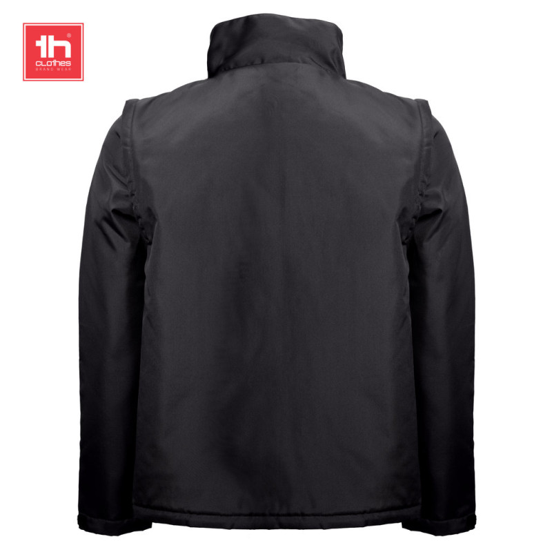 Mangas removíveis através de fechos • Gola forrada a malha polar • Acesso com fecho na parte inferior das costas para facilitar a personalização • Casaco acolchoado 2 em 1 convertível em colete • Abertura com fecho YKK • Presilha para pendurar no interior da gola • Punhos ajustáveis com tira de velcro • Dois bolsos frontais com fecho e puxador e dois bolsos no peito