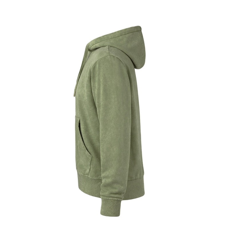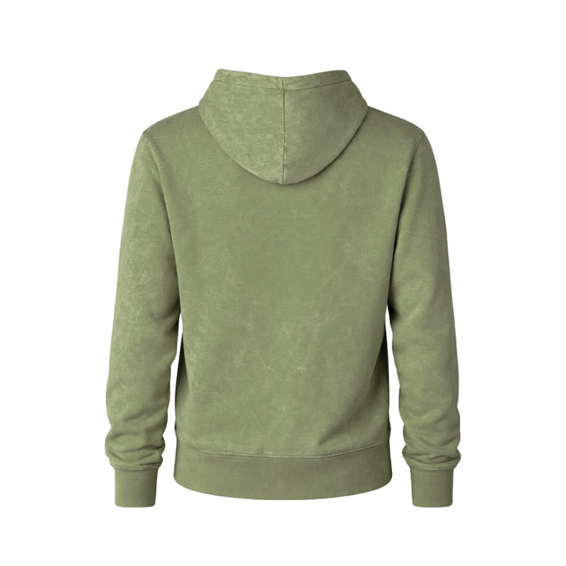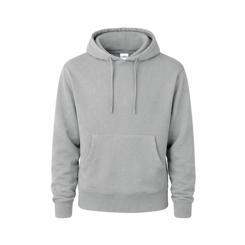 Unisex hooded sweatshirt with washed jeans effect, making each piece unique and unrepeatable. Kangaroo pocket, with extra wide elastic bands for a perfect fit. Contrast color in the elastic bands of cuffs and hem. Made in 100% combed cotton 280g/m2. Soft touch and modern cut, with adjustable flat strings and embroidered eyelets, avoiding the use of metal. Double stitching for durability and resistance to intensive wear. Easily removable label and available in sizes XS, S, M, L, XL and XXL.