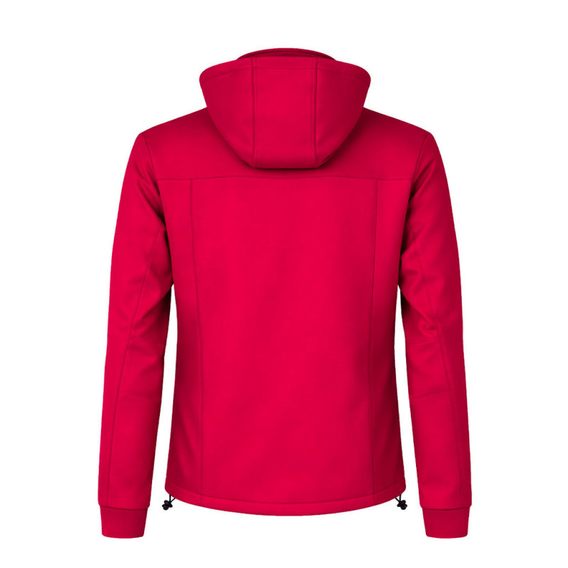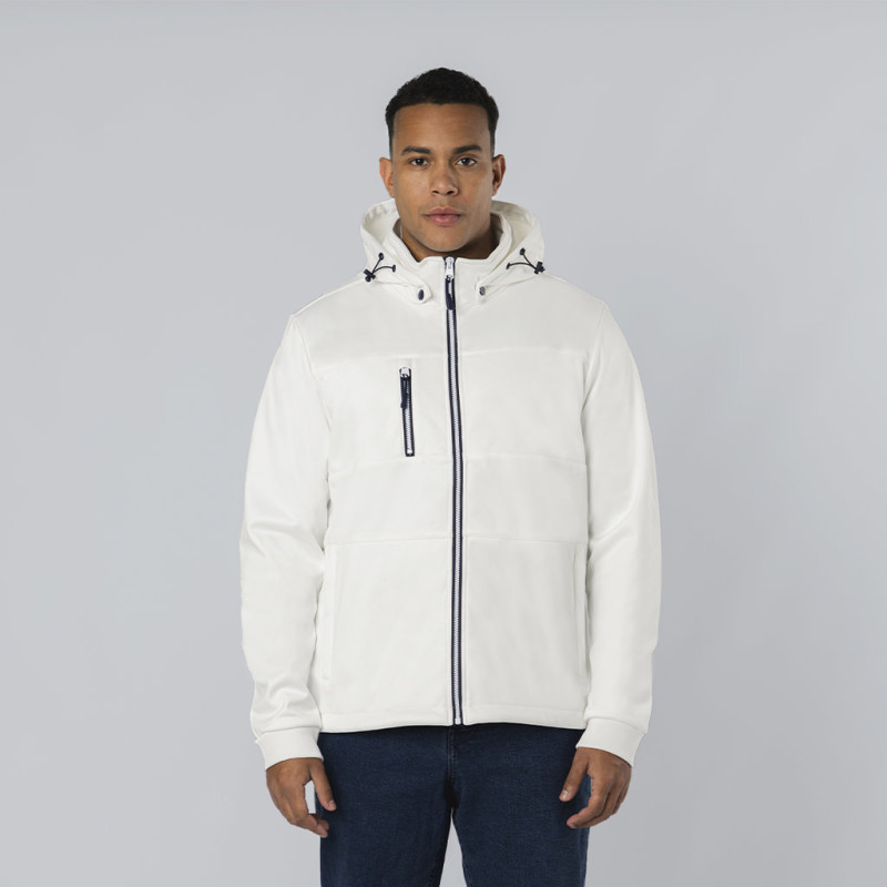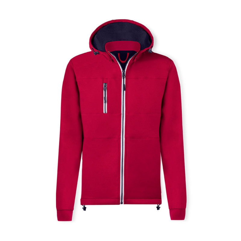 Jacket made of durable and breathable 300g/m2 soft shell material. Modern fit with central zip, side pockets and practical chest pocket with zip fastenings and contrasting zip pullers. Stand-up collar with adjustable and detachable hood. Bottom hem with adjustable string. Wind and water resistant soft shell outside, and warm micro fleece lining in contrast colour. Available in sizes XS, S, M, L, XL, XXL.