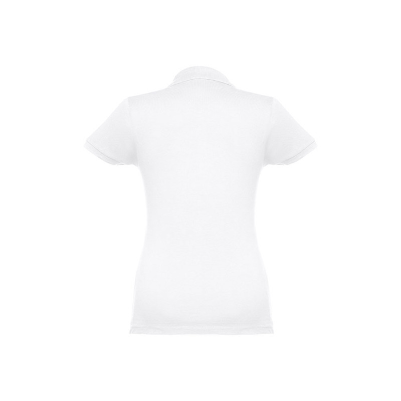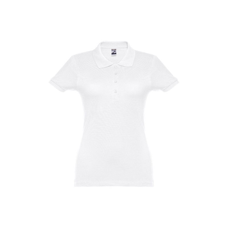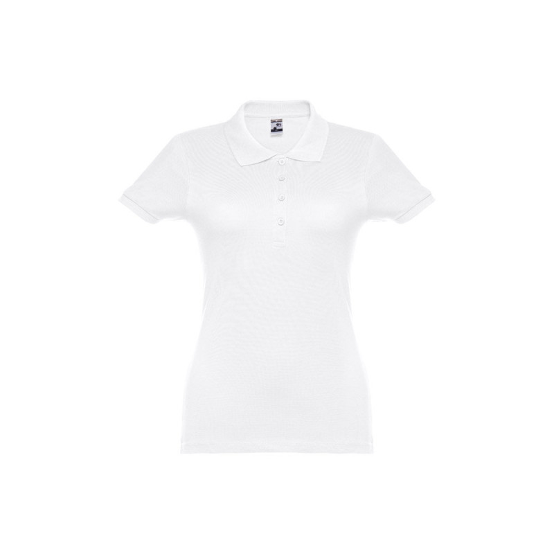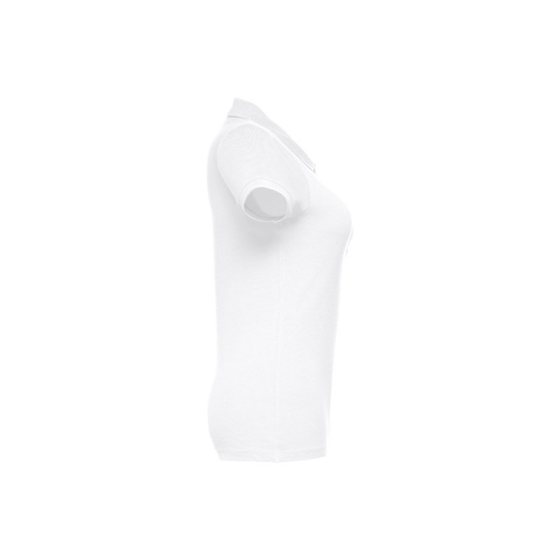 100% carded cotton pique women's short sleeve polo (195 g/m²). Features a rib collar and sleeves, the collar is reinforced with piqué ribbon. On the front, next to the collar, there are four matching colour buttons (extra button inserted in the inner seam). Piece cut and sewn. Sizes: S, M, L, XL, XXL