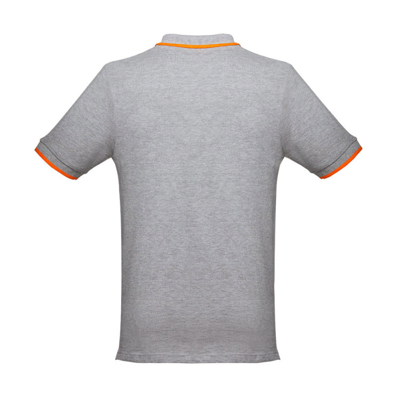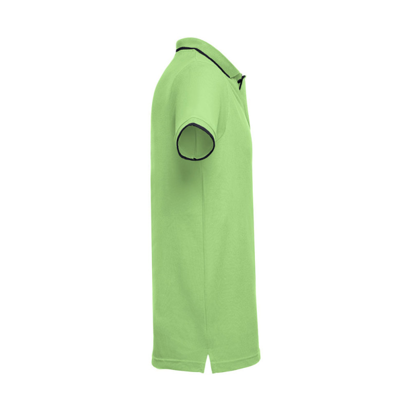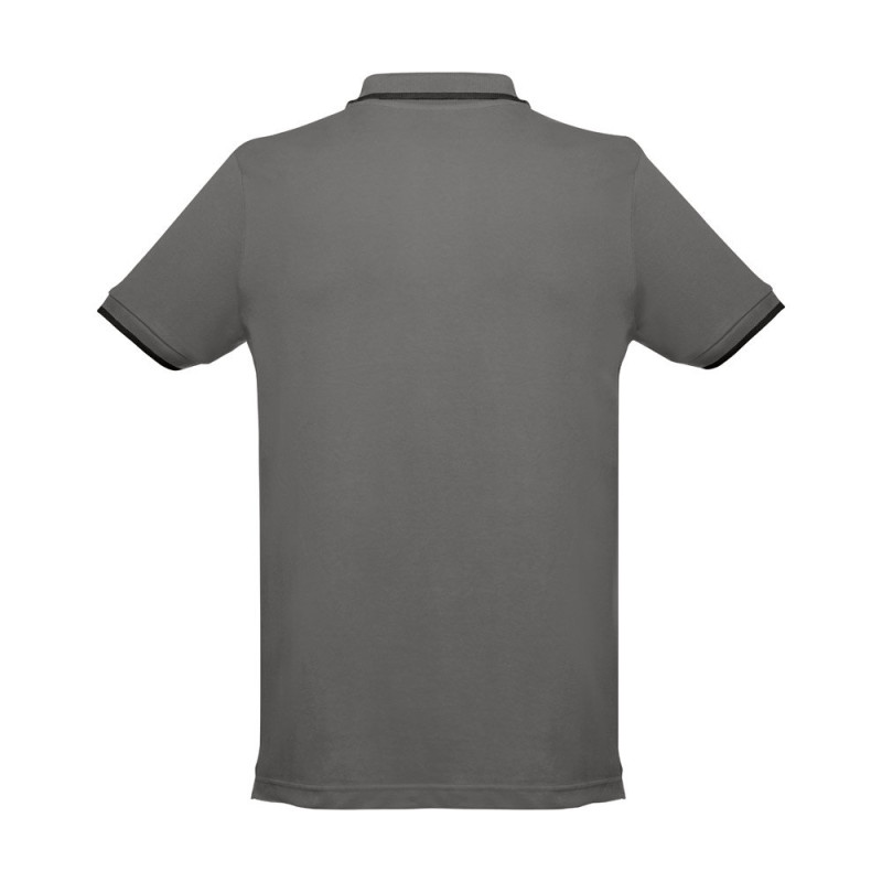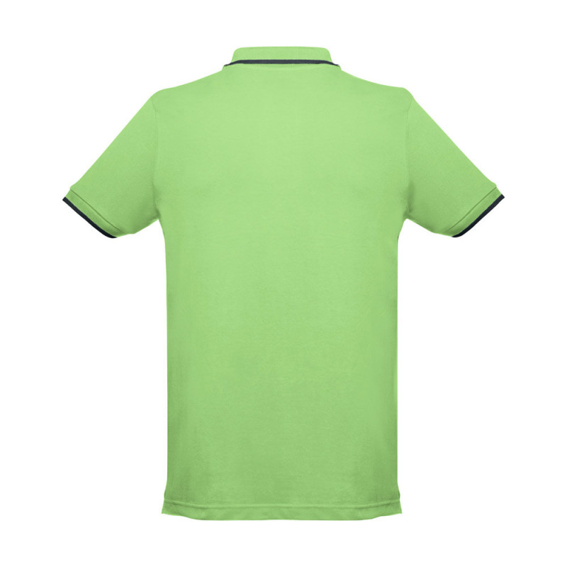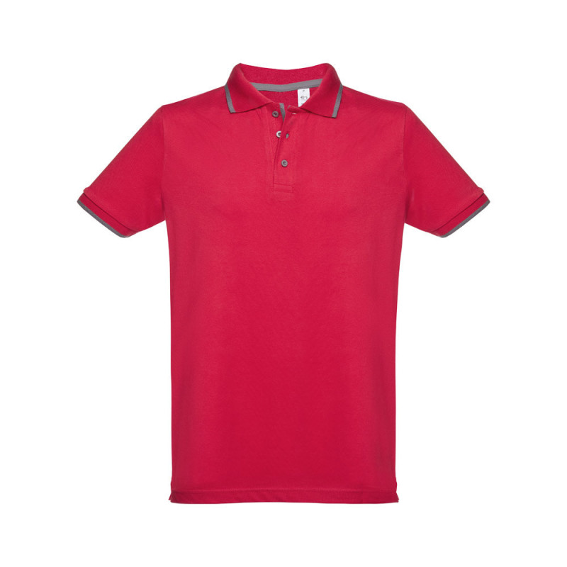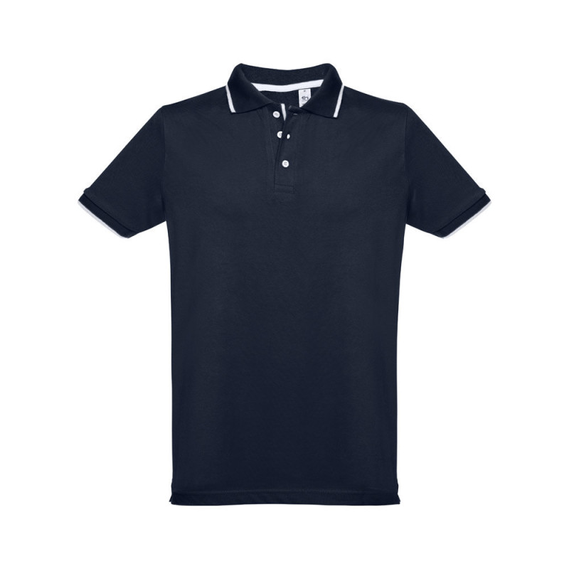 Short-sleeved bicolour polo for men in piqué 100% cotton carded (210 g/m²) (colour: 183: 85% cotton/15% viscose). Two-colour contrast on the collar, sleeve and placket. Features a collar and cuffs in Rib. Reinforced placket with 3 contrasting colour buttons (extra button inserted in the inner side seam). Fitted waist and small side vents at the hemline of the polo. Sizes: S, M, L, XL, XXL