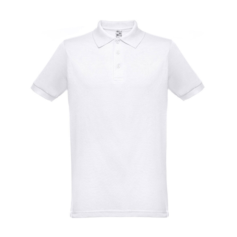 Short sleeve polo shirt for men in piqué mesh 35% carded cotton and 65% polyester (200 g/m²). Regular cut polo with rib collar and sleeves, the collar being reinforced with piqué knit ribbon. Features a reinforced collar with 3 matching colour buttons (extra button inserted in the inner seam). Piece cut and sewn. Sizes: XS, S, M, L, XL, XXL